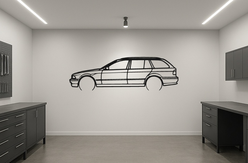 Komplekt sisaldab BMW 5 E39 metallist autosiluetti ja seinakinnitust.