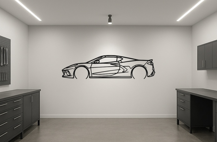 Komplekt sisaldab Chevrolet C8 Corvette metallist autosiluetti ja seinakinnitust.