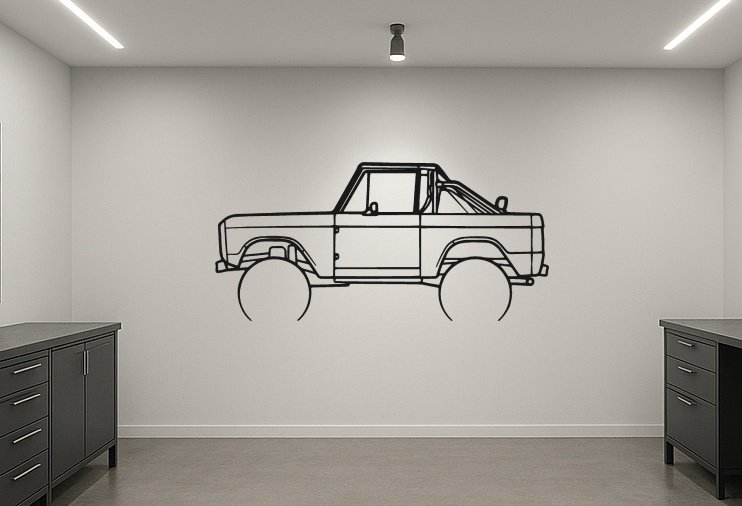 Komplekt sisaldab Ford 68 Bronco metallist autosiluetti ja seinakinnitust.