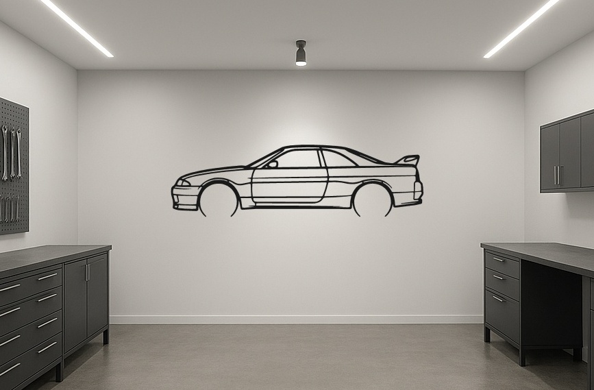 Komplekt sisaldab Nissan R33 Skyline metallist autosiluetti ja seinakinnitust.