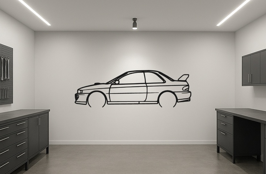 Komplekt sisaldab Subaru 96 Impreza GT metallist autosiluetti ja seinakinnitust.